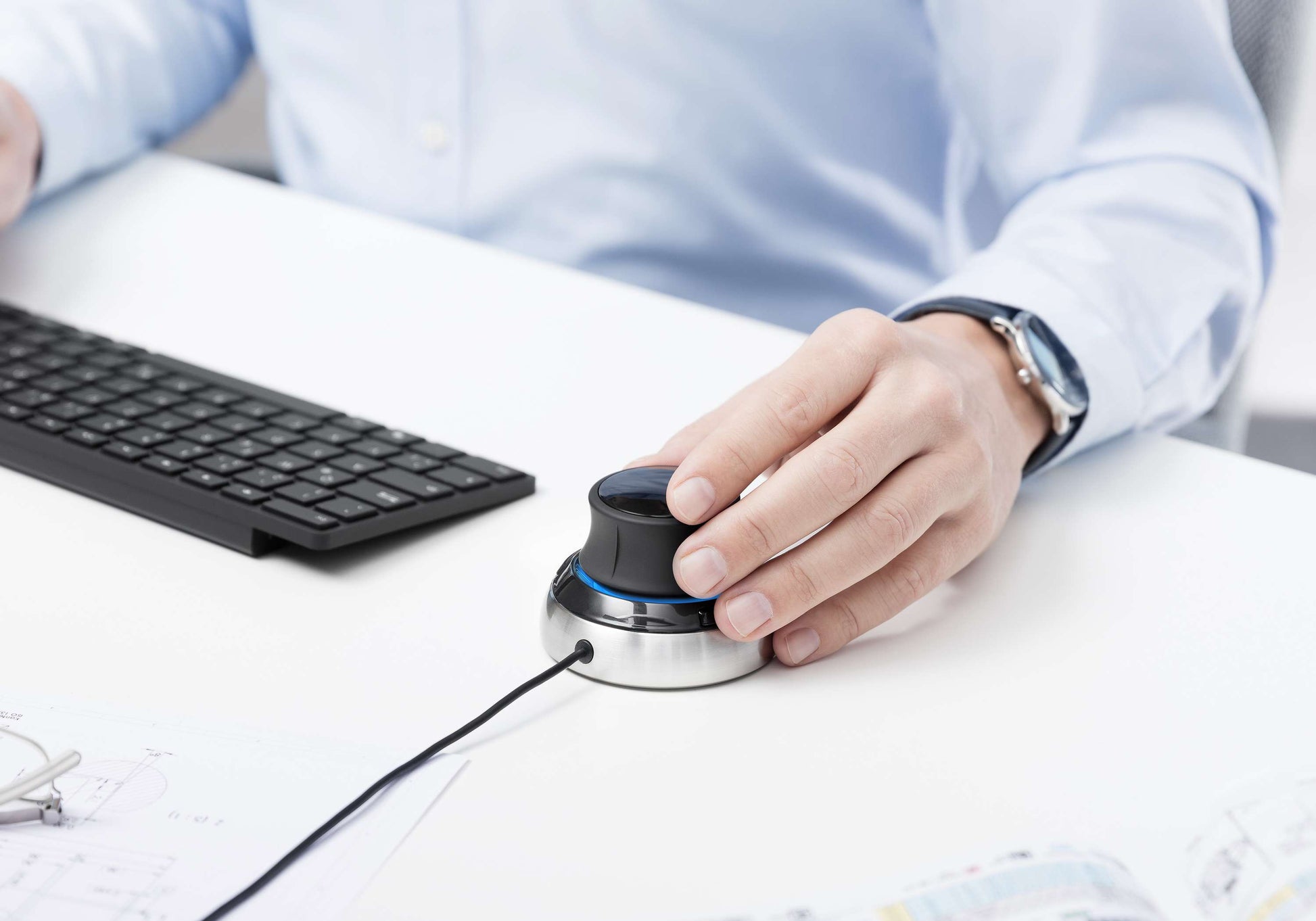 Den patenterade 6DoF-sensorn (six degrees of freedom) gör det möjligt att panorera, zooma och rotera 3D-modeller med mjuka, naturliga rörelser. Du styr modellen med ena handen via SpaceMouse Compact, medan den andra används för markering och redigering med en vanlig mus – ett beprövat tvåhandsflöde som ger bättre kontroll och högre precision än traditionell musnavigering.