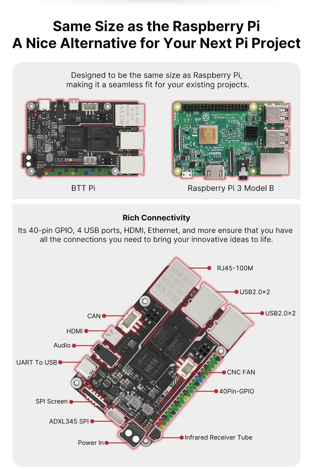 Tack vare sin 64-bitars processor, 1 GB DDR3L RAM och dedikerade anslutningsmöjligheter, fungerar BTT Pi V1.2 som en kraftfull hjärna i ditt Klipper-setup. Den erbjuder en flexibel och stabil plattform med GPIO för expansion, HDMI-utgång för skärm, USB-portar och skruvplintsanslutning för säker strömförsörjning.