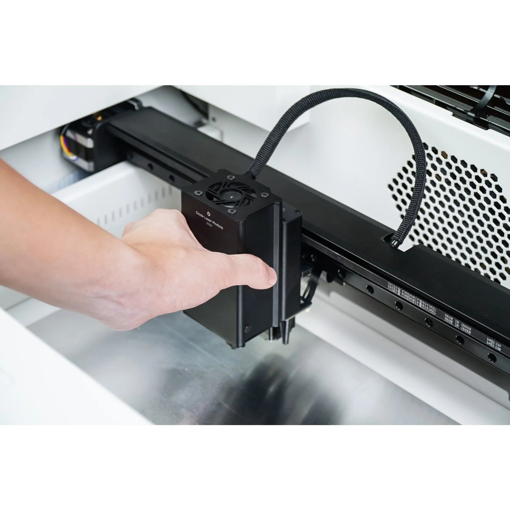 Den kraftfulla 10 W eller 20 W diodlasern möjliggör exakt gravering och skärning i material som trä, läder, papper, tyg och svart akryl, medan den valbara 2 W IR-lasermodulen öppnar för gravyr i metall och metalliska material. Med Printing Module adderas färg till projekten genom CMYK-baserat eco-solvent-bläck, vilket gör det möjligt att skriva ut både enfärgade motiv, blandade färger och gradienter direkt på plana material.