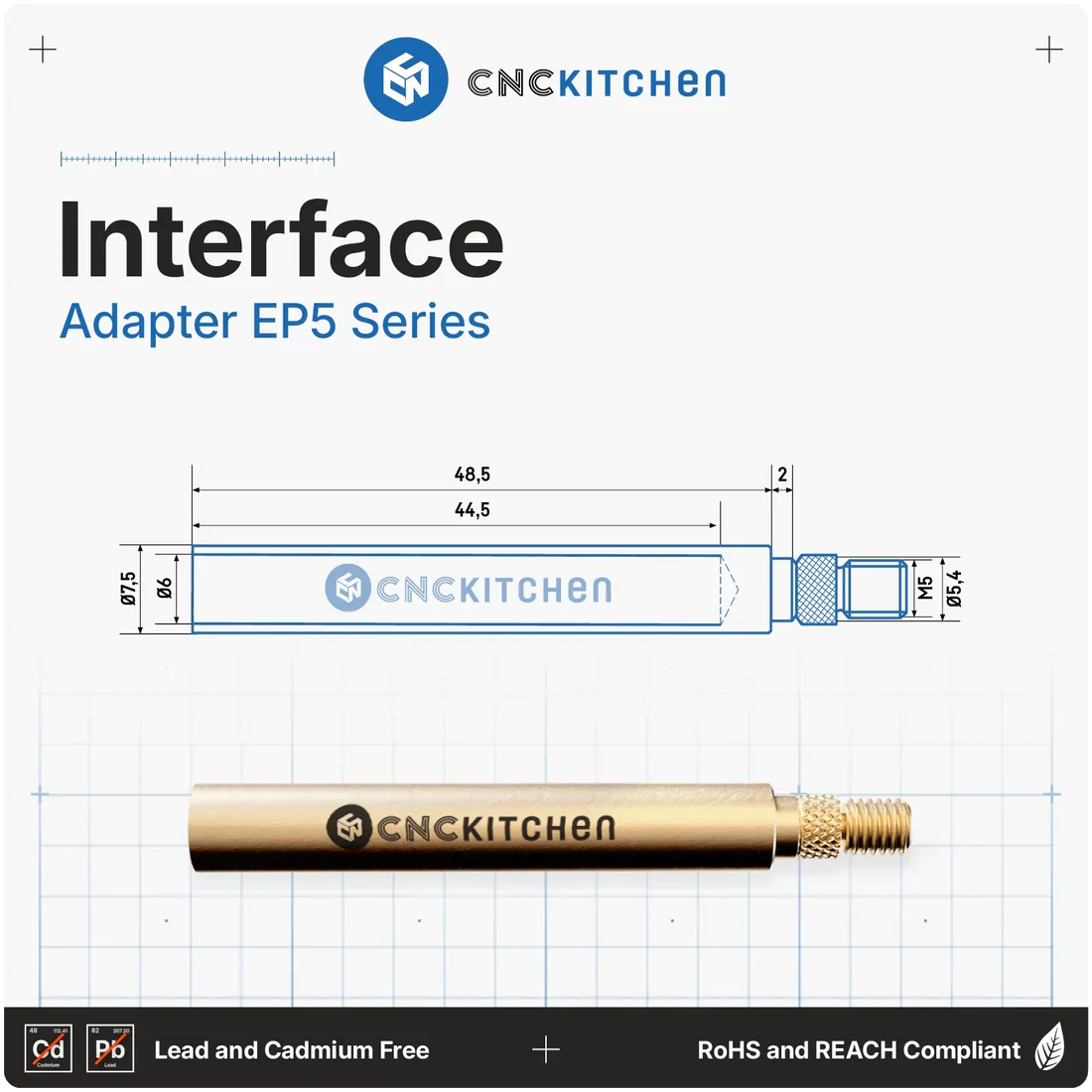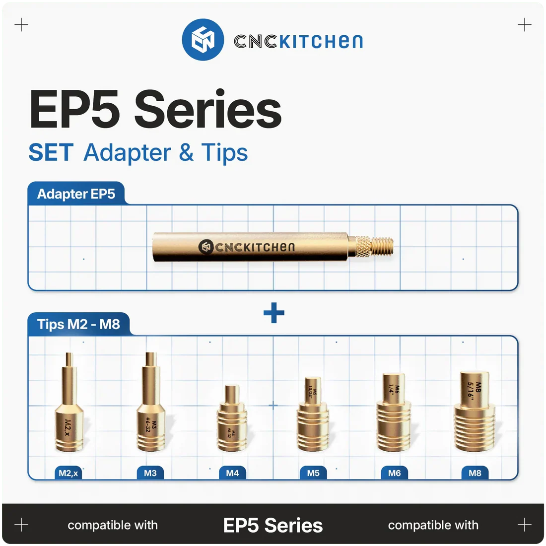 CNC Kitchen Lödspetsar SET kompatibla med EP5 är ett professionellt utvecklat tillbehör för exakt och pålitlig installation av gängade insatser i 3D-utskrivna delar. Setet är fullt kompatibelt med EP2 Standard och kan enkelt anpassas tack vare den medföljande adaptern, som vid behov kan förkortas med såg – se tillhörande gränssnittsritning för korrekt montering.