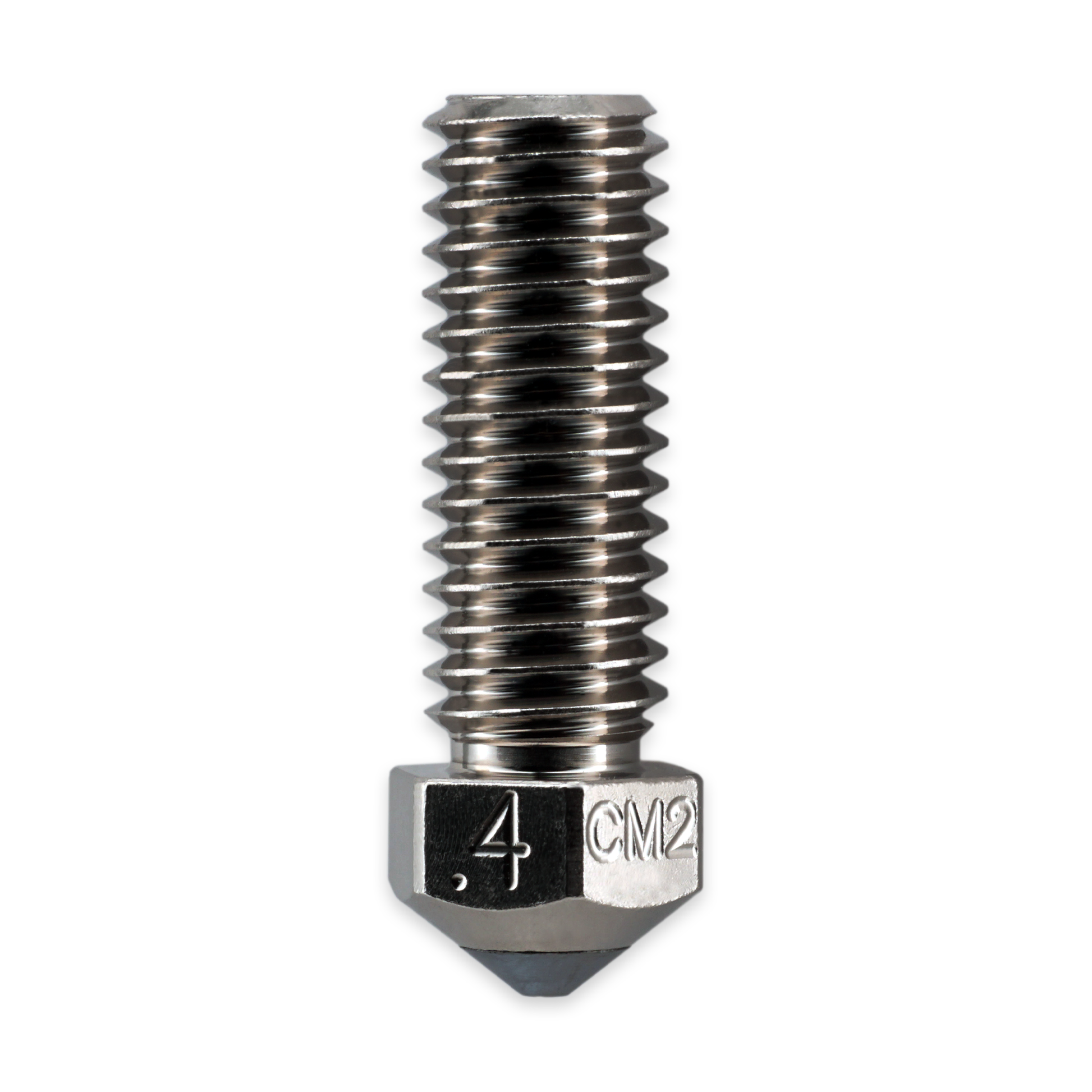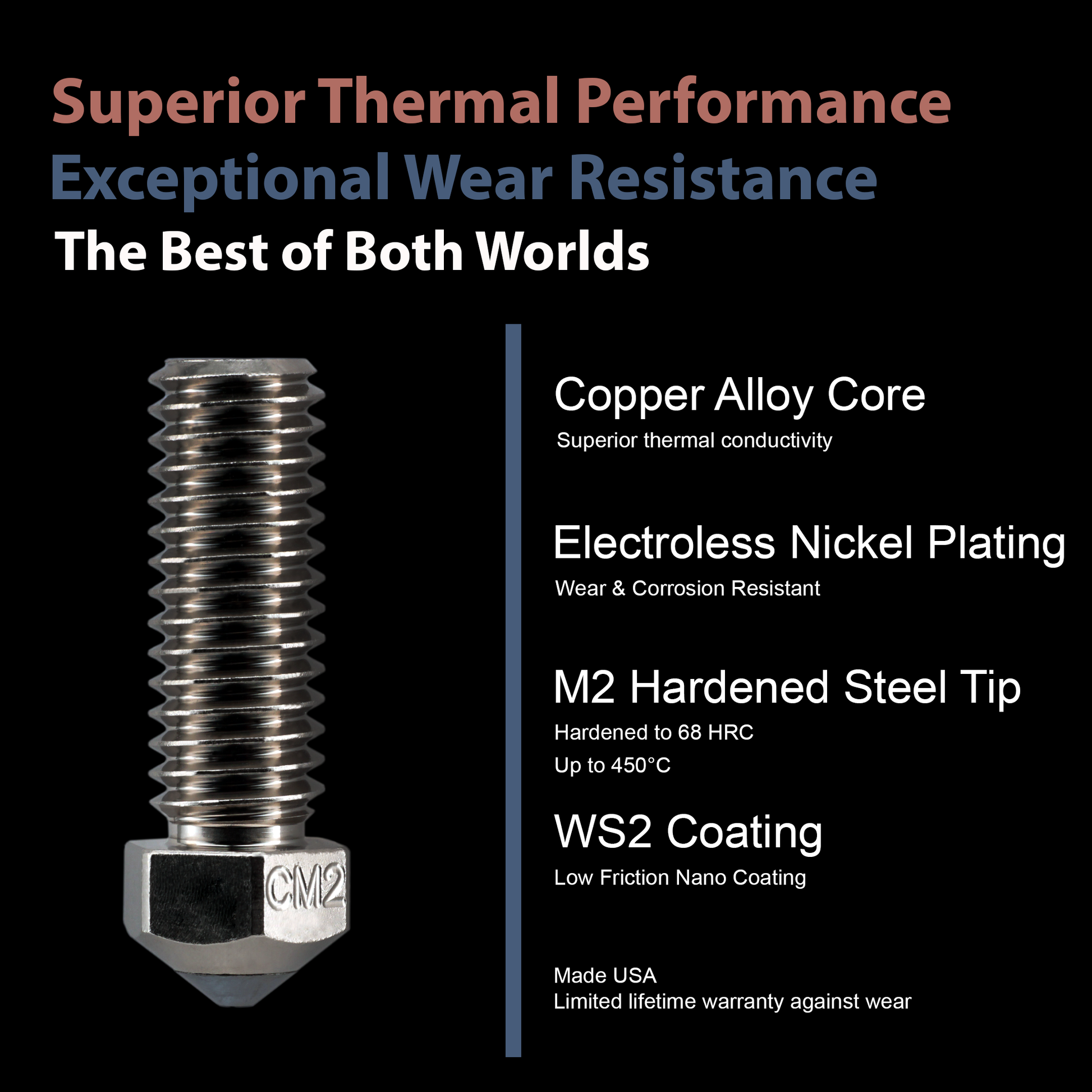 CM2-serien är framtagen för att ge hög livslängd även vid utskrift med abrasiva material som kolfiber, metallfyllt PLA, träkompositer eller polykarbonat – och är fullt kompatibel med E3D Volcano och liknande hotendblock.