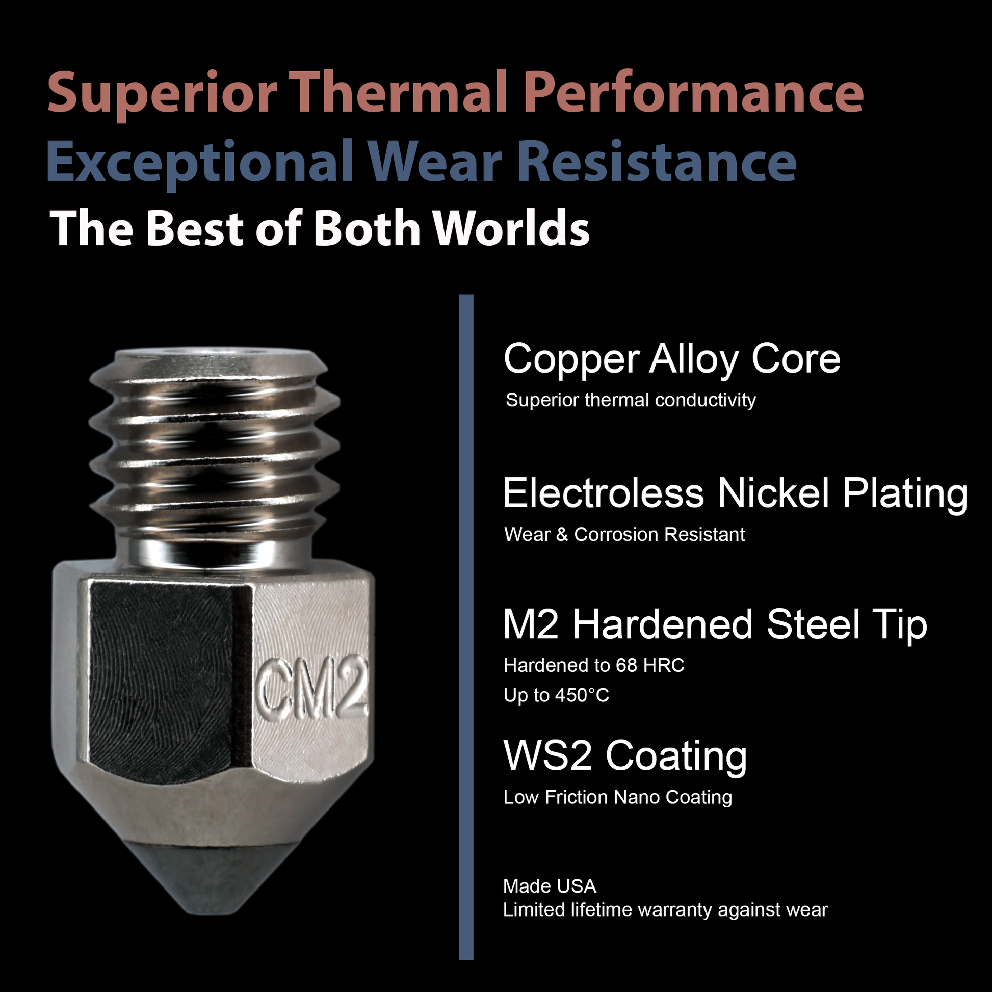 Micro Swiss CM2™ MK8-munstycke är ett högpresterande extrudermunstycke för krävande FDM-applikationer där hög flödeskapacitet och slitstyrka är avgörande. Konstruerat med en kärna av koppar-krom-zirkonium och en spets i M2-härdat snabbstål, ger detta munstycke överlägsen termisk ledningsförmåga kombinerat med lång livslängd – även vid användning av abrasiva filament.