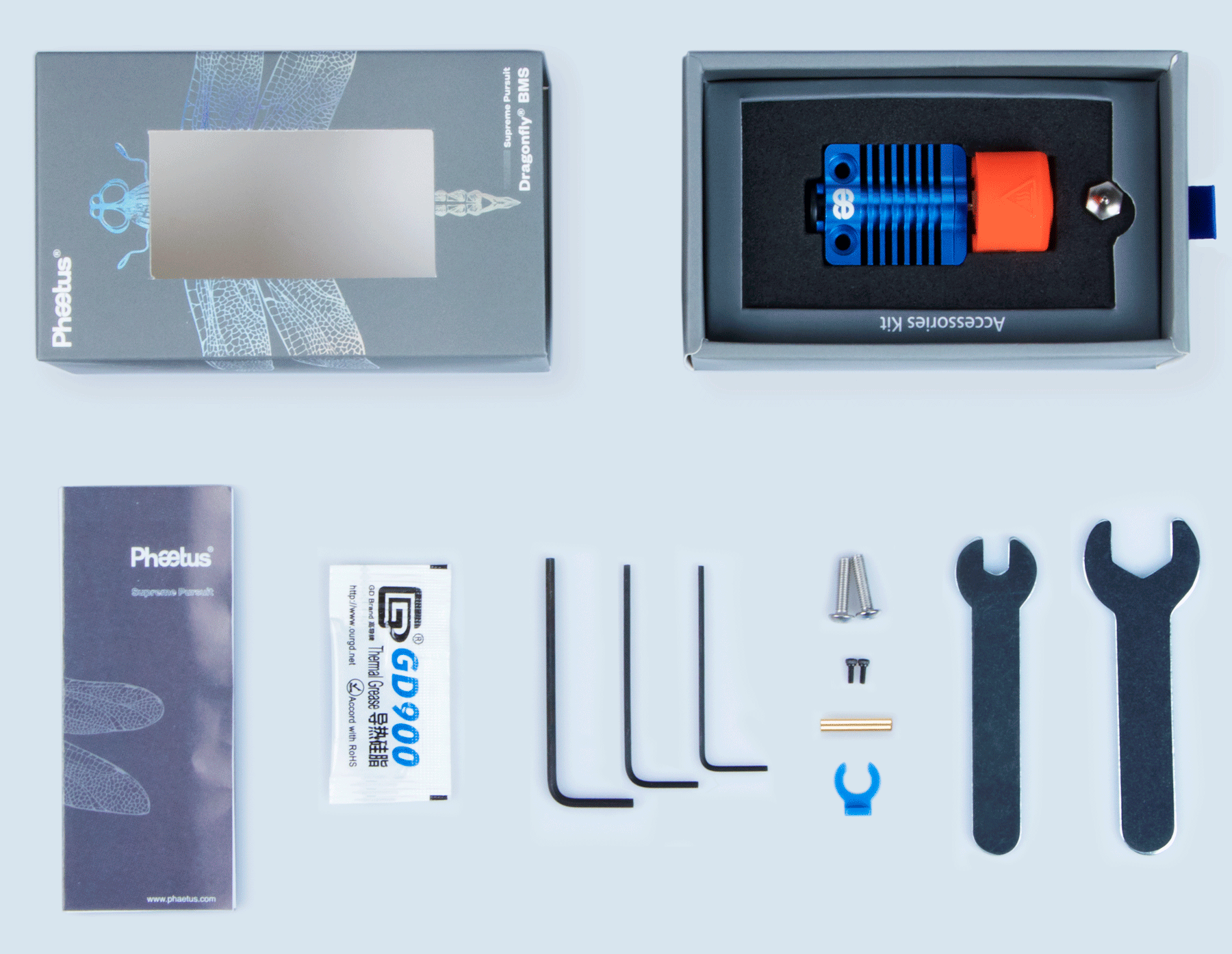 Phaetus Dragonfly BMS är ett helmetall-hotend designat för krävande utskrifter och höga temperaturer – upp till hela 500 °C. Med komponenter i pläterad koppar, härdat stål, mässing och aluminium, erbjuder denna hotend exceptionell värmeledningsförmåga, hög slitstyrka och stabil extrusion för alla typer av filament – inklusive de mest avancerade tekniska materialen.