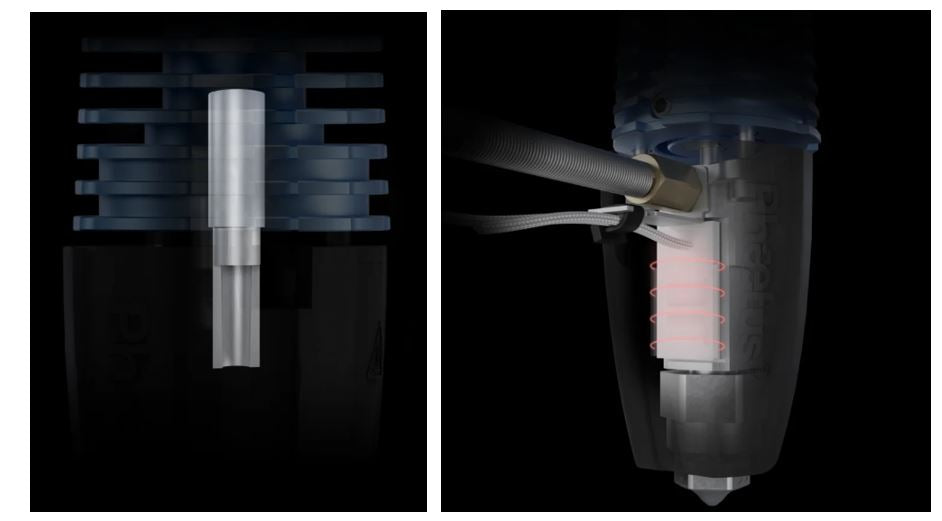 Med en konstruktion i förnicklad koppar, titan och aluminium, samt en ny rektangulär keramisk värmeenhet, når hotenden 200 °C på endast 35 sekunder och hanterar temperaturer upp till 350 °C. Den ultratunna titan-heatbreaken ger optimal värmeisolering och motverkar värmekrypning – en nyckelfaktor vid utskrift av fiberförstärkta material i höga volymer.