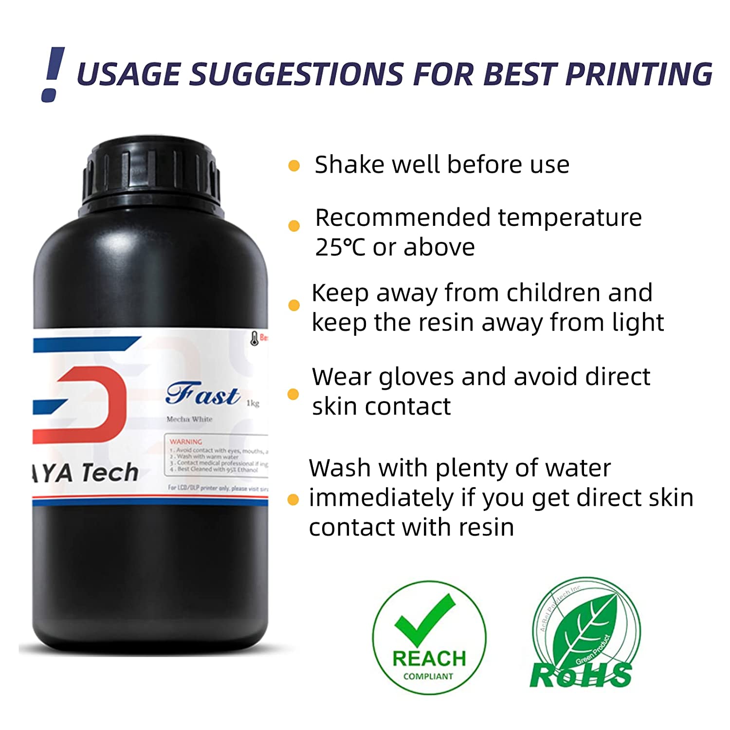 Det fungerar utmärkt med LCD- och DLP-skrivare (405 nm) och ger en slät, matt vit yta som lämpar sig väl för målning, efterbearbetning och presentation. Den låga lukten och enkla rengöringen gör arbetsflödet behagligt och effektivt – perfekt för både nybörjare och proffs.